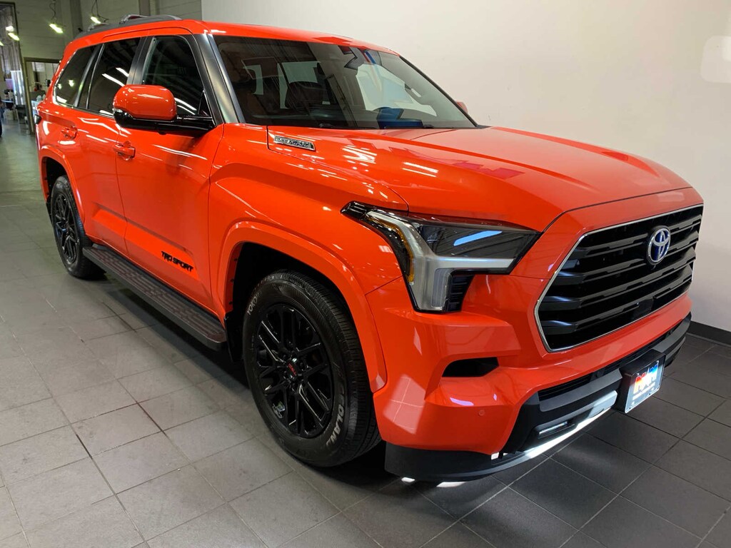power folding third row and hands-free power liftgate, 400W/120V AC Rear Seat & Cargo Area Power Outlet, Radio: Toyota Multimedia w/14 Display, 8-speakers, wireless Android Auto® and Apple CarPlay® compatibility, SiriusXM w/3-month platinum plan trial subscription, Connected Services - Safety Connect w/up to 10-year trial subscription, Remote Connect, Service Connect w/up to 10-year trial, Wi-Fi Connect w/up to 3GB within 1-month trial and Drive Connect, See toyota.com/audio-multimedia and toyota.com/connected-services for details, TRD SPORT black badging on front doors, Bilstein shocks, red TRD engine start button, TRD leather shift knob and aluminum sport pedals, Tires: P265/60R20 (ILA), Wheels: 20 TRD Sport Matte-Black Alloy, TRD center caps, ROOF CROSS BARS (TMS), HEATED LEATHER STEERING WHEEL. Toyota SR5 with Solar Octane exterior and Black interior features a V6 Cylinder Engine with 437 HP at 5200 RPM*. Local Trade-In